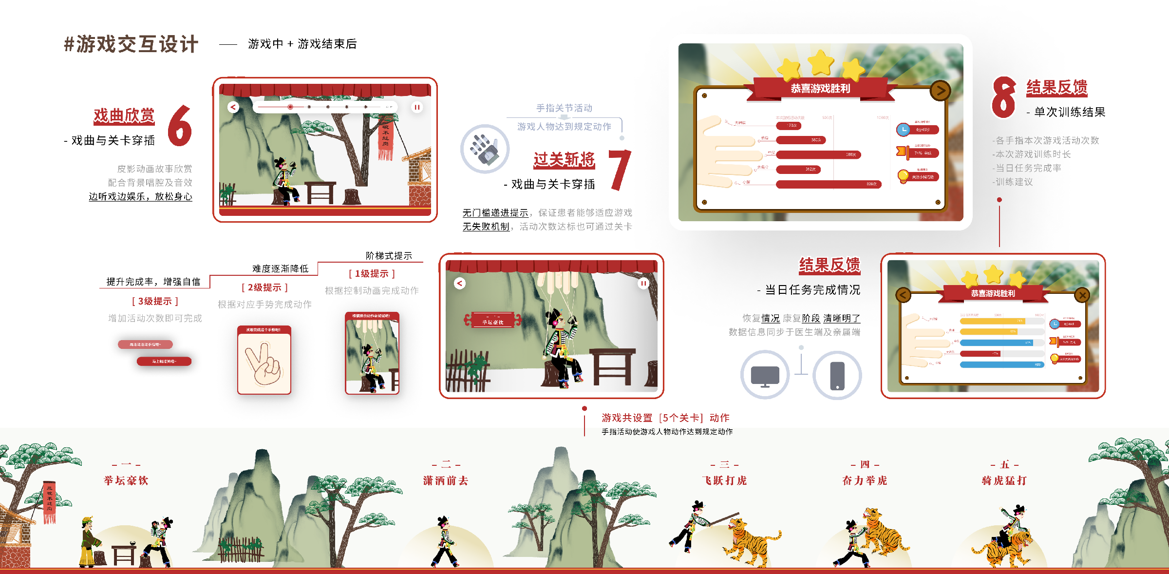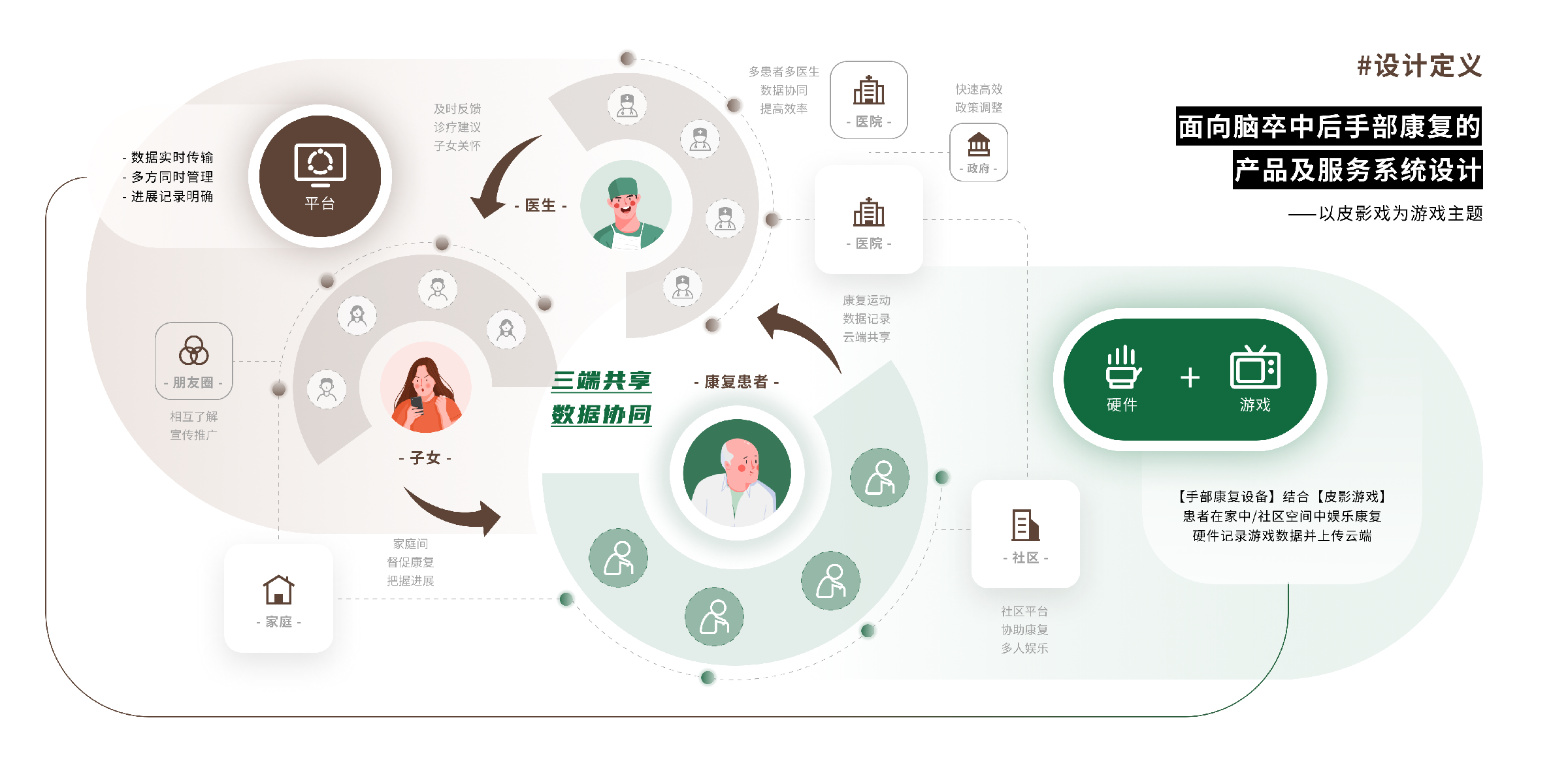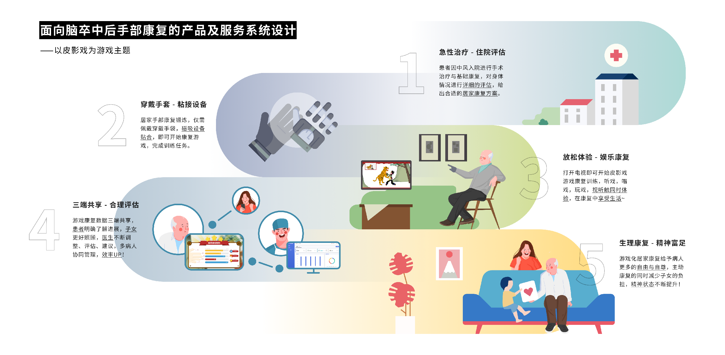 从脑卒中患者后期手部康复训练出发,探索娱乐化居家康复机制,结合中华传统文化皮影戏完成游戏设计,同时从医、患、家属三方沟通的问题出发,设计康复数据多端共享平台,完善整体服务设计。
