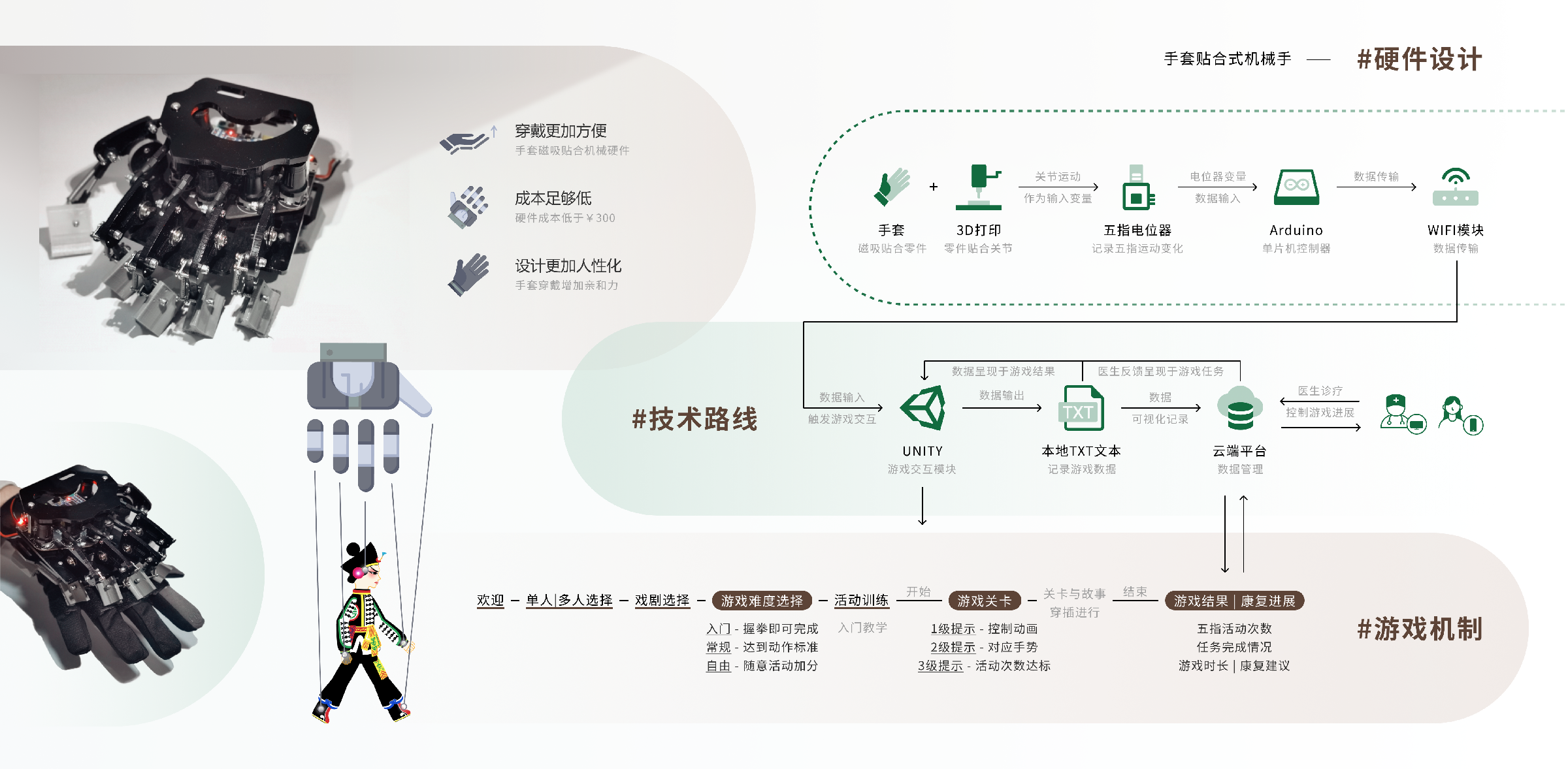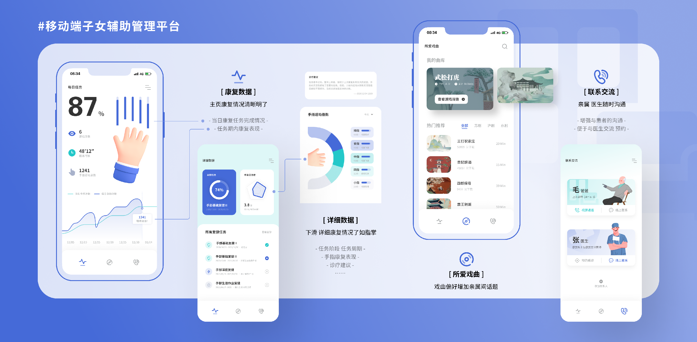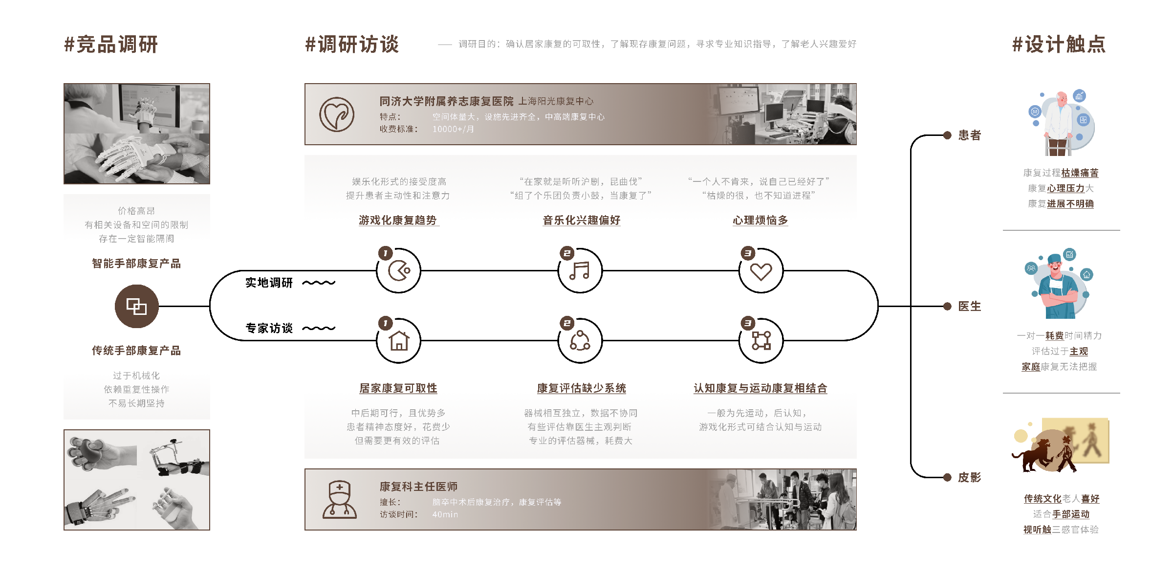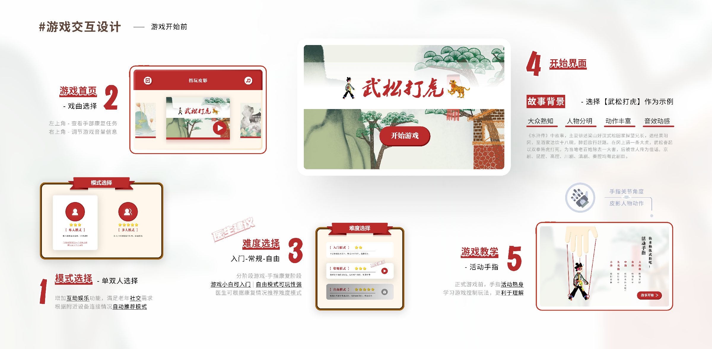 从脑卒中患者后期手部康复训练出发,探索娱乐化居家康复机制,结合中华传统文化皮影戏完成游戏设计,同时从医、患、家属三方沟通的问题出发,设计康复数据多端共享平台,完善整体服务设计。