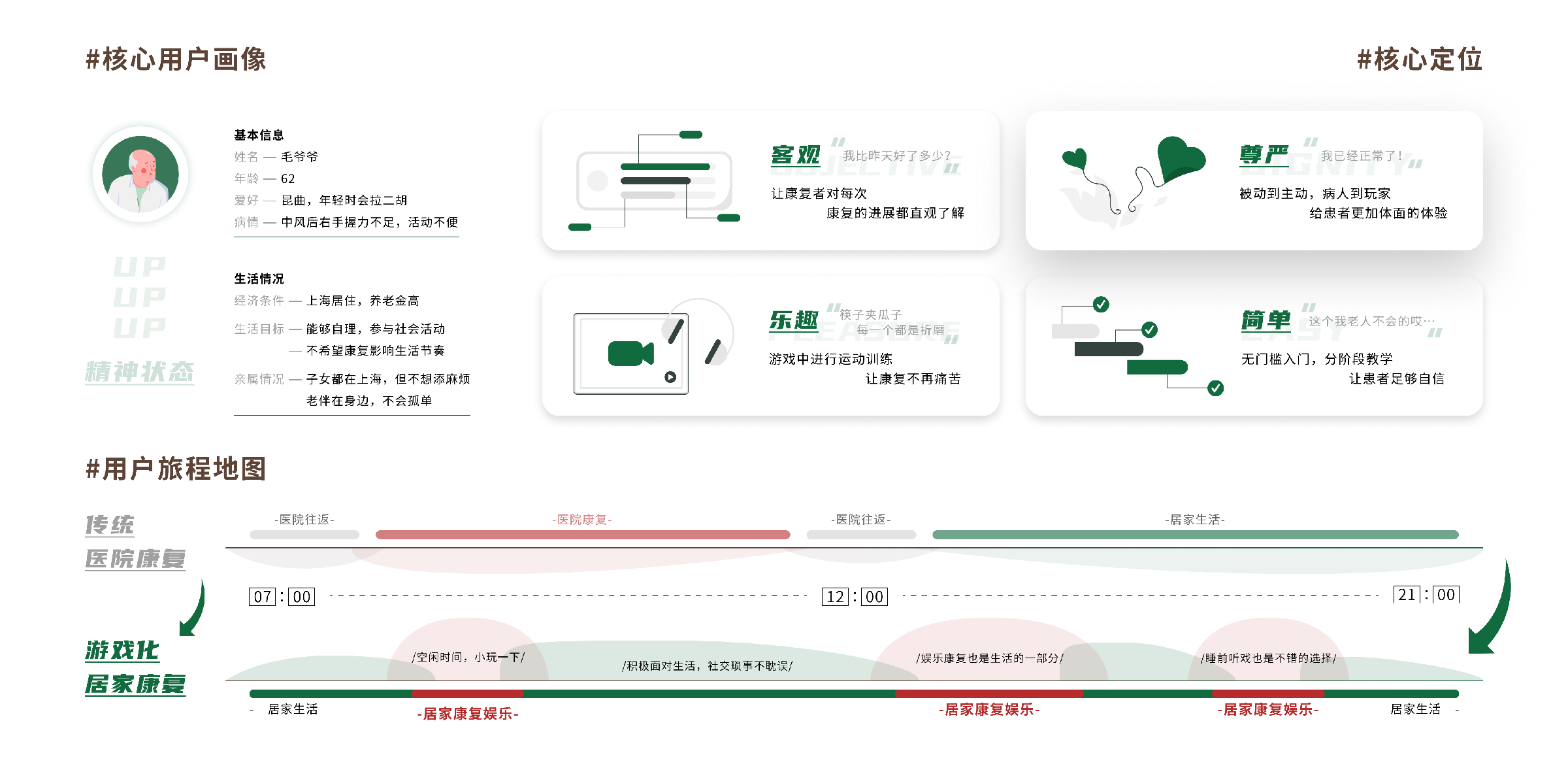 娱乐化社区居家康复早已经是近几年火热的话题,调研中也发现在消费较高的康复中心,娱乐化的形式已成为主要康复训练方法。这次设计尝试我们不仅考虑如何娱乐化,更是想要将娱乐化便利于每位病人与医生,从商业可行性,康复有效性,心理主动性,系统可用性等多个方面提出了一套完整的方案设计,希望为脑卒中康复提供完整的解决方案。